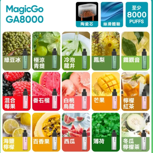 我們為台灣市場嚴選多達20款國際熱銷風味,每一款均由RELX實驗室精心調配,並通過GA8000的優越霧化芯完美呈現: